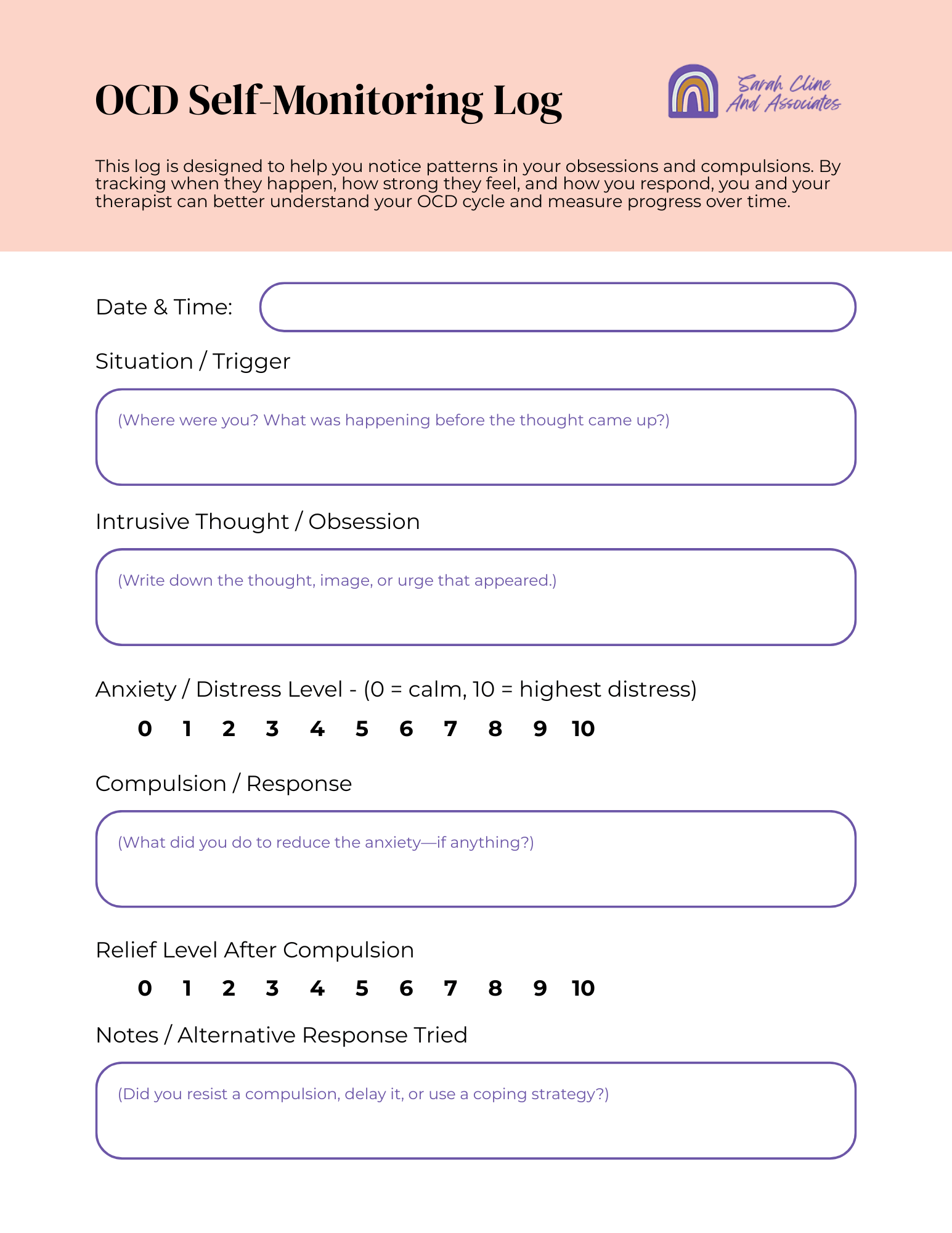 Tracking your thoughts, feelings, and behaviors can help you and your therapist see patterns in your OCD. This worksheet gives you a simple way to record obsessions, compulsions, and anxiety levels, so together we can identify triggers, measure progress, and practice new strategies over time.