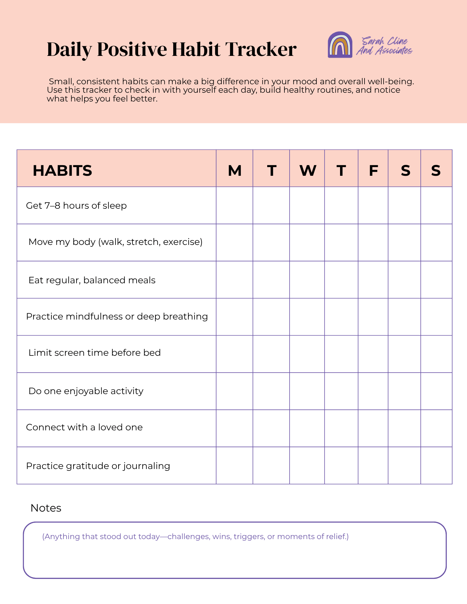 Small, consistent habits can make a big difference in your mood and overall well-being. Use this tracker to check in with yourself each day, build healthy routines, and notice what helps you feel better.